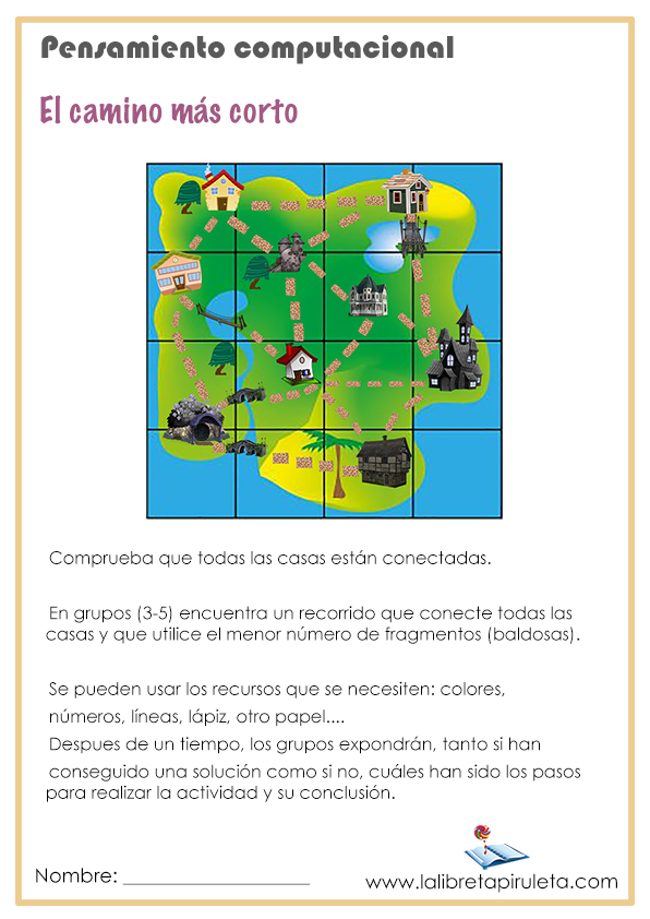 Es una actividad muy sencilla. Lo único que tenemos que hacer es encontrar un recorrido que conecte todas las casas y que utilice el menor número de fragmentos (baldosas). Si se dan cuenta les he dicho “un camino” no “el camino”. Esto es debido a que hay más de una solución, y todas ellas son correctas. Como docentes, solemos abusar de expresiones como “esto está mal”, “esto otro no es correcto”…